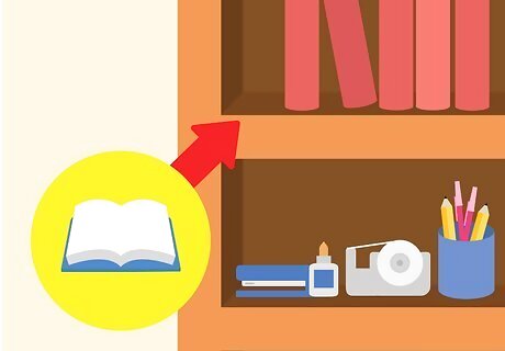Get a small bookshelf or filing cabinet. If you deal with a lot of files, forms, or other paperwork that must be stored and referenced as part of your job, you will find it immensely helpful to have all your papers organized onto a bookshelf or in a filing cabinet. Nothing creates more clutter than papers scattered across a desktop. Ask your supervisor if there are any unused shelving materials or cabinets that you can move into your cubicle. Many offices have surplus materials that sit in storage until they are needed. This is a better option than reaching into your own pocket to pay for a work-related necessity. If you choose to use a bookshelf, also purchase hard-cover, three-ring binders to hold your paperwork. These stand up easily on shelves and keep papers from falling out or becoming mixed up. If you don't have space in your cubicle for a filing cabinet or bookshelf, Ask your supervisor if there are any communal filing cabinets or bookshelves you might be able to use. Just be sure to avoid placing sensitive or confidential information in a place anyone can access.