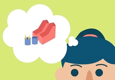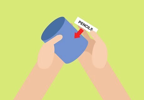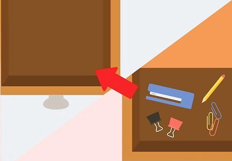 Purchase desk organizer materials. The best way to keep your desk neat is to keep various categories of items separated. Your workspace will quickly descend into disarray if you have to dig through a pile or stack to find things you need. Desk organizers can be purchased at any office supply store (such as Office Depot, Staples, or The Container Store) and are handy tools for making sure this doesn't happen. Examples include: Drawer trays/dividers. These create separated containers within desk drawers to keep small, loose items from moving around or becoming jumbled together. Stacked inbox sorters. These are small desktop shelves which can be assigned categories for different types of ingoing/outgoing paperwork. Pen/pencil cups. This simple device simply holds your pens and pencils and provides easy access to them. They take up minimal desk space and save valuable real estate in desk drawers.