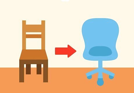 Replace your desk chair. If your company-supplied desk chair is uncomfortable or broken, ask your supervisor if you can have it replaced. If the chair your company is willing to provide is unsatisfactory, look into buying your own. Sitting down all day can be tough on the body, and your productivity will increase if you are at least working from a comfortable chair. If your company will not replace your chair and you cannot afford to buy one, look into accessories that may improve your comfort level. This could include a lumbar support pillow, arm rest pads, a seat cushion, etc. If you purchase your own chair for use at work, be sure to keep the receipt so there is no confusion as to its ownership. You may also want to mark the chair or label it with your name.
