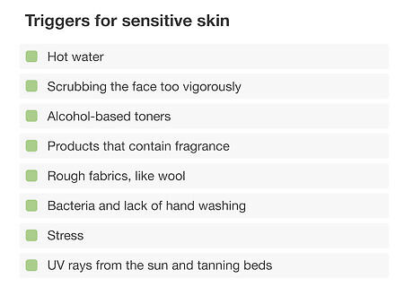 Identify what triggers your sensitive skin, and avoid these whenever whenever possible. Triggers are highly variable between people, and it takes experience to find out what causes your skin to become irritated (it will be different for each person). Triggers may include: particular weather (such as sun, heat, wind, and/or cold) certain cosmetics certain soaps stress your menstrual cycle (for females), although this one cannot be avoided.