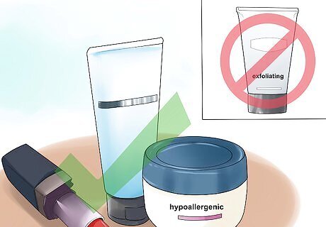 Select appropriate cosmetics and skin care agents for your skin. Using the wrong products can worsen your sensitive skin, so it is best to get a handle on what works for you before attempting to add acne treatments. Avoid products that contain alcohol, menthol, or “exfoliating” agents. These can irritate skin and make acne worse. In general, using fewer products on your skin is better. Look for products that are labeled "hypoallergenic" at the drug store or pharmacy. Or, ones with fewer ingredients (and more natural ingredients) tend to be a better bet. Always observe the response of your skin to various cosmetics and soaps. Go by trial and error and eliminate those that cause you trouble.