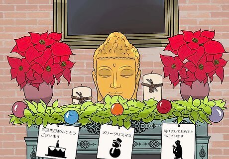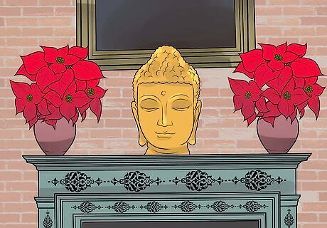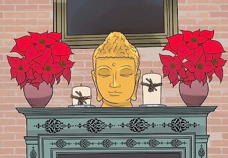 Take advantage of seasons and holidays. Seasons and holidays offer a great excuse to change your mantel. You can use flowers and rabbit figurines for springtime or leaf garlands and pumpkins in autumn. Here are some other ideas to get you started: For Valentines day, place a glass vase filled with red roses in the middle of your mantel. Arrange white or ivory candles to either side of the vase. During the winter, include a few snow globes or glittery snowflakes. For Christmas, drape an evergreen garland across your mantel. Decorate it with red berries, holly leaves, and a few white or ivory pillar candles.