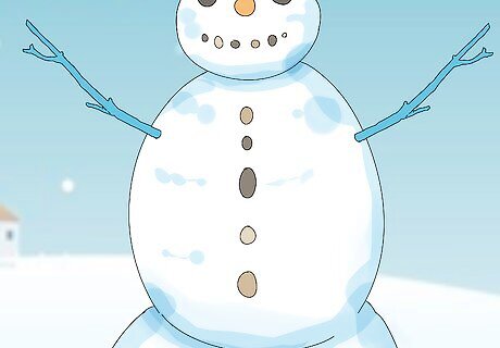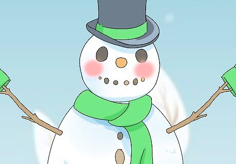 Add arms. Use sticks as arms. Simply push them in at the sides, either stick downward or outward (it all depends on how expressive your snowman decides to be). The size of the sticks will be determined by the size of your snowman.