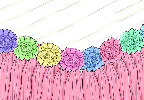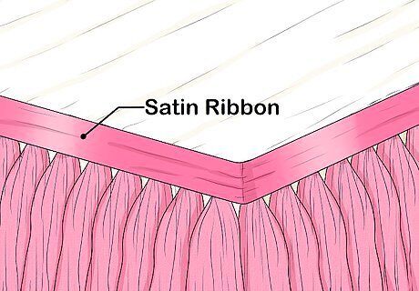 Wrap satin ribbon around the top edge for a simple look. Choose a ribbon color that goes well with your table. Measure the circumference of your table, then cut the ribbon accordingly. Wrap the ribbon around the tabletop so that it covers the knots. Use a drop of hot glue or fabric glue every 6 to 12 inches (15 to 30 cm) to secure the ribbon to the tutu. Make sure that the ends of the ribbon are in the back of the table. Match the color to the tutu or the tablecloth. You can also use a darker shade than the tutu (i.e.: dark pink ribbon for a light pink tutu). Choose a ribbon that is wide enough to cover the knots. Something that is at least 1 inch (2.5 cm) will work fine, but you can go wider.