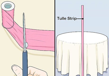 Cut your tulle into strips that are twice the height of your table. Measure the height of your table first, from the floor all the way to the table top. Double your measurement, then cut your tulle into strips that match that length. How many strips you cut depends on how much coverage you want on your table. Cut just a few for right now. Cut a piece of cardboard to the height of your table. Wrap the tulle around it, then cut the bottom edge to separate the strands.