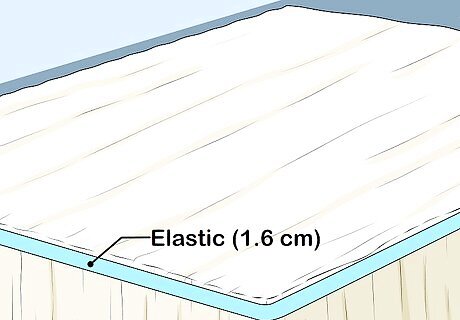 Wrap elastic around the table and secure it in the back. Wrap ⁄8 in (1.6 cm) wide elastic around the edge of your table. Tie the ends together in the back of the table with a double-knot, or overlap them and secure them with a pin. Pin the elastic to the tablecloth every 6 to 12 inches (15 to 30 cm) so that it doesn't slide off. Match the elastic color to the tulle. Fold-over elastic is a great option because it comes in many colors. Wrap the elastic tightly enough so that it doesn't slide off, but loose enough so that you can still slide your finger under it.