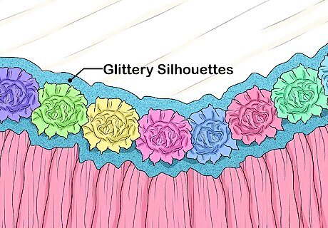 Upgrade a ribbon or flower trim with glittery silhouettes, if desired. Wrap your ribbon or chiffon flower trim around the table first. Next, use a stencil to trace shapes onto the back of glittery scrapbooking paper. Cut the shapes out, then secure them to the trim with hot glue or fabric glue. Use shapes and colors that match your theme. For example, use princess crowns for a princess party, or hearts for a wedding. The shapes should be around 6 to 8 inches (15 to 20 cm) tall. Don't get carried away. You only need 1 shape at each corner, and 1 shape in the middle.