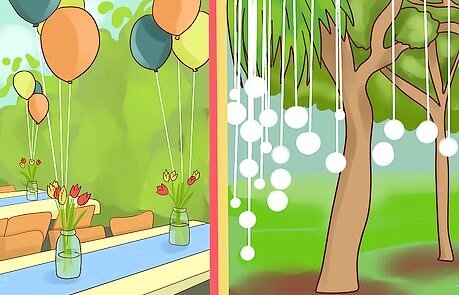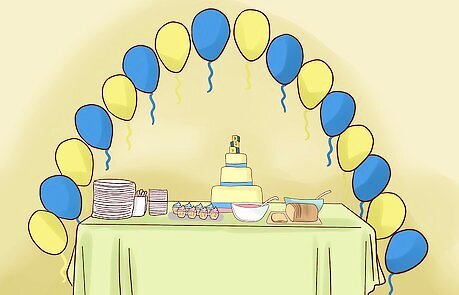 Make the table the central focus. The table is the centerpiece of the entire shower, so you should put special effort into making it look good. Make sure the table is large enough to comfortably seat all of the guests and cover it with a nice tablecloth and possibly a table runner in a contrasting color. Sprinkle baby shower confetti over the tablecloth. Lay any pre-prepared cakes and desserts out on the table, buffet style. Use pretty tiered cake stands to display any cakes, scones, muffins or other treats. A layered cupcake stand filled with frosted cupcakes makes a great centerpiece. Aside from the food, you can decorate the table with flowers and votive candles. The flowers can be elaborate arrangements from the florist's or simple but beautiful cuttings from the garden, depending on the theme of the party and the time of year. If you are serving hot food at the party, one cute idea is to place any necessary condiments, such as mustard, mayonnaise or salad dressing, in baby bottles. Just cut the tops of the teats for easier pouring. Make sure you have enough plates, knives, forks, spoons, glasses and napkins. Polish the silverware if necessary. Then you can either formally set the table, or stack everything to one side until needed.
