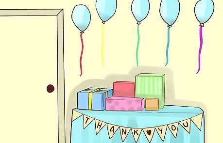 Place the guestbook and gift table beside the door. Beside the entrance to the party you will need two things - a baby shower guestbook and a table for gifts. The baby shower guestbook (which can be a special store-bought one or just a cute notebook) is an important feature of the party. In it, each guest can write their best wishes for the mother-to-be and her baby, along with any parenting tips or funny anecdotes about their own experiences as mothers. Place the guestbook, along with some nice writing pens, on a small table just inside the door. Leave it propped open so guests can easily see what it's for (or maybe even make a little sign to explain). Cover the table with a nice cloth and decorate it with baby shower confetti, a vase of flowers, a hurricane with floating candles, some baby toys or whatever fits the theme of the party. You will also need a separate, larger table where guests can set their gifts down as soon as they walk in the door. You can decorate this table as you see fit - just make sure there will still be enough room for the gifts. As an alternative to the gift table, you could place a crib or baby stroller beside the door for guests to place their gifts in instead. The crib or stroller could be borrowed from somebody else, or be a gift to the mother-to-be itself.