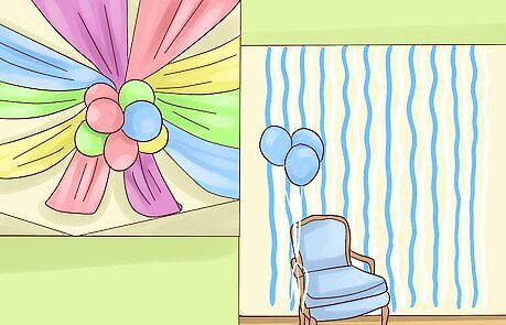 Decorate the walls and ceiling. The walls and ceiling are the next thing you'll need to think about. Things like streamers, wall hangings and mobiles can really transform the look of the room and make the baby shower extra special. Themed baby shower streamers are available from most party supply stores, in a vast array of colors and designs. Alternatively, you could make your own flag garland from scraps of colored or patterned fabric, for a more personal, traditional touch. Another very cute idea is to hang a clothesline from one side of the room to the other and use safety pins or old-fashioned clothes pegs to hang baby clothes such as baby grows, booties, socks and bibs. Another option is to hang mobiles from the ceiling - these can be actual baby mobiles, or paper ones in the shape of flowers, hearts or baby accessories like rattles, baby bottles and pacifiers. For the walls, you can hang more banners or flag garlands, put up framed photographs of the mother and father-to-be as babies, or hang posters related to your theme, such as stills from specific films (for movie themes), or images of baby animals (for jungle themes). Another great idea is to hang swathes of tulle along the walls, from floor to ceiling. This creates a pretty, almost ethereal effect which transforms the entire room. Stringing fairy lights across the tulle will add to this effect even more.