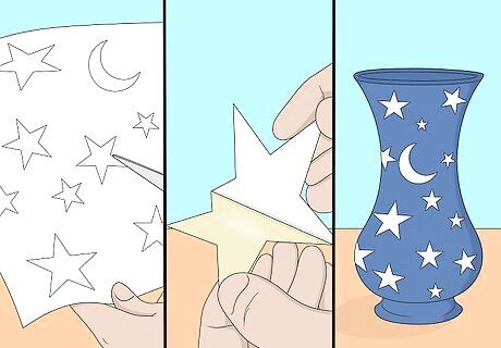 Attach adhesive paper to the vase for a quick pattern. Purchase patterned paper in a sticker form at a local craft store or online, making it easy to attach it to a vase. Cut out the shapes you’d like from the paper, remove the adhesive backing, and press the paper onto the vase. For example, cut out flowers or leaves from the adhesive paper and stick them onto your vase. Cut adhesive paper into strips to create a striped pattern on your vase.