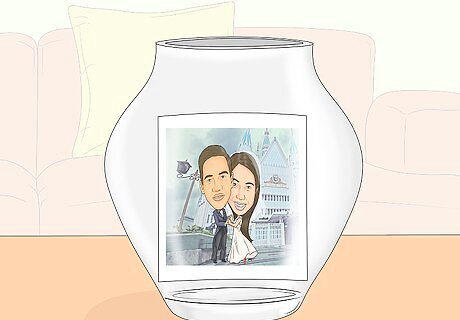 Place photos in the vase to use them as a picture frame. This works well if your glass vase has a wide opening. Gently place the photo in the vase so the image is facing out of the vase. Bend the photo slightly so that it fits against the curve of the vase. Place a black and white 4 in × 6 in (10 cm × 15 cm) photo in a short wide vase, or stack colored photos on top of one another in a tall vase.