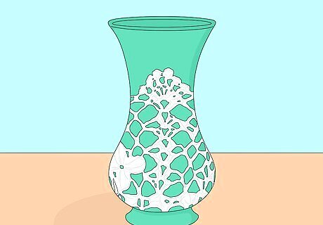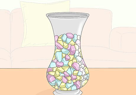 Use colored stones or sea glass to create patterns in the vase. Fill a glass vase one-fourth of the way full with blue sea glass, or layer colored stones on top of one another to create a multi-colored pattern. Pour the stones into the vase and use your hands to spread them out in an even layer. Look for colored stones or sea glass at your local craft store or big box store. If you can’t reach the stones to spread them out in the vase, gently shake the vase to distribute the stones evenly. For example, create layers of pink, orange, and yellow sea glass in the vase.