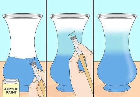 Create an ombre pattern on the vase for a chic look. Decide what your darkest color will be and paint this onto the vase going around the very bottom. Tint the dark color with a bit of white, and apply a ring of this paint right on top of the bottom ring on the vase. Keep tinting the color lighter and applying another ring to create an ombre look on the vase. For example, your vase might start off with a navy blue ring around the bottom of the vase, and then continue with colors such as royal blue, sky blue, and light blue.