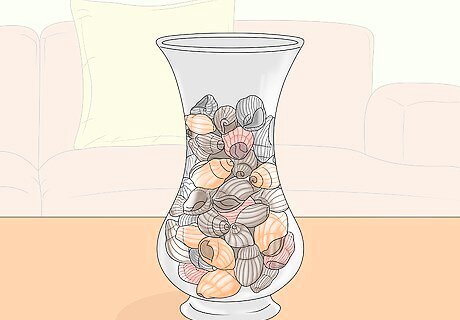 Pick out seashells to fill the vase. Use seashells from a recent trip to the beach, or purchase shells from a craft store or online. Gently place the shells in the vase, stacking them on top of one another until they reach your desired height. Pick out enough shells to fill the entire vase, if desired. Fill the bottom section of the vase with sand for a soft bottom layer.