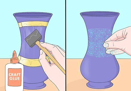 Cover the vase in glitter for a sparkly effect. Either apply a clear craft glue to the entire vase, or tape off a section of the vase using painter’s tape before applying the glue. Spread the glue in a thin even layer using a foam craft brush, and sprinkle the glitter onto the glue in a thick layer. Gently shake the excess glitter off to reveal your glittered vase. Cover an entire vase in silver glitter, or place a piece of painter’s tape around the middle of the vase and apply glitter to the bottom half. Create a design using glue before sprinkling the glitter onto the vase for a more intricate design.