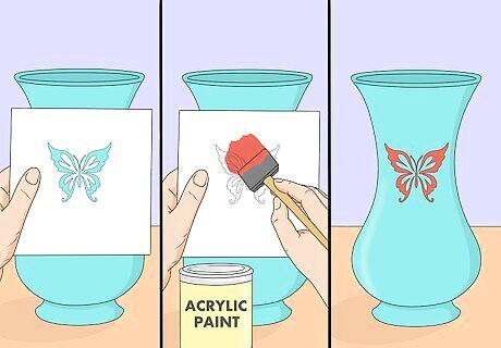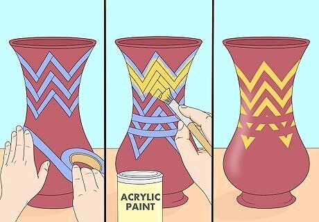 Place painter’s tape along the vase to create geometric shapes with paint. Cut off strips of painter’s tape and place them on the vase, pressing down firmly to make sure the paint won’t get up under the tape. Paint each section of the taped off vase a different color using acrylic paint to create a geometric design. Cut the painter’s tape into thinner strips if you want smaller divisions between the colors. Wait for the paint to begin drying before peeling off the tape.