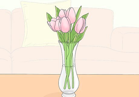 Fill the vase with large leaves or flowers for a floral arrangement. Pick out fabric or plastic plants from a craft store, or opt for real leaves or flowers to put in your vase. Place leaves in the vase so their shiny side is facing outwards, and situate any flowers in the vase so their petals are visible. Fill the vase with synthetic daisies, or pick out large leaves from a plant in your garden to display in the vase.