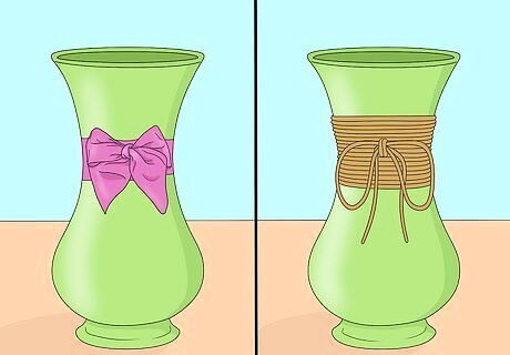 Tie ribbon or twine around the vase for a simple decoration. Select a ribbon in a color and thickness of your preference. Tie the ribbon around the vase in a bow, or cut the ribbon so it’s just long enough to fit around the vase and glue it in place in a single stripe. To use twine, wrap several layers of twine around the vase and tie it off in a simple bow. Tie a large gold ribbon around the vase, or cut several strands of white, yellow, and orange ribbon to glue them around a vase in parallel lines.
