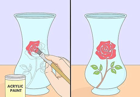 Paint flowers or other objects on the vase for a freehand option. Do this using a small paintbrush and acrylic paint, or use paint pens designed for glass. Decide what kind of design you want to paint on your vase, such as flowers, geometric shapes, or intricate line patterns. Go slowly as you paint to avoid making mistakes. You might paint tulips along the outside of the vase using paint pens, or you could paint leaves on the vase using a paintbrush and green, yellow, and orange paint.