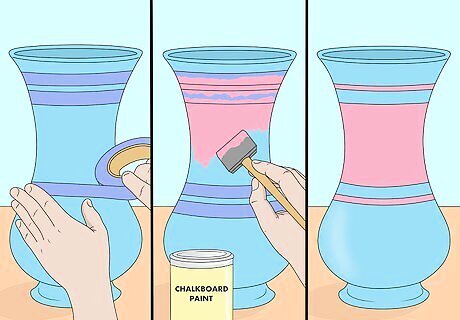 Apply chalkboard paint to the vase to turn it into a chalkboard. Purchase a chalkboard paint from your local craft or big box store. Either paint the entire vase using the chalkboard paint, use painter’s tape to create sections for you to paint, or freehand paint the vase to create a more intricate chalkboard design. Use a craft foam brush to apply the chalkboard paint to the vase. You may need to do several coats of the chalkboard paint to make it thick enough to use.