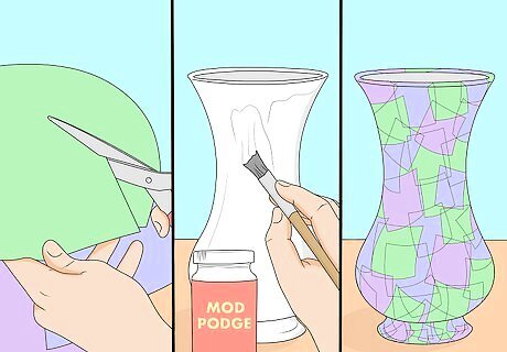 Apply tissue paper to the vase for a textured look. Pick out which colors of tissue paper you’d like to use, and cut them up into shapes. Apply a layer of mod podge to the vase using a craft foam brush, and place the tissue paper shapes on the vase so they stick to the adhesive. Dab the vase with a final layer of mod podge to ensure the tissue paper stays in place. For example, cut green, blue, and purple tissue paper into squares and create a mosaic pattern on the vase. Cut the tissue paper into circles made up of many different colors and adhere them to the vase randomly for a dotted vase.