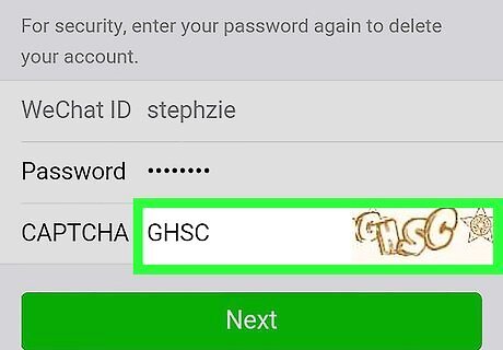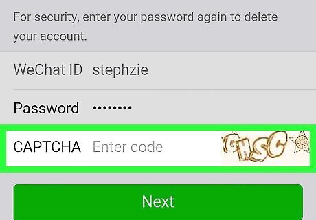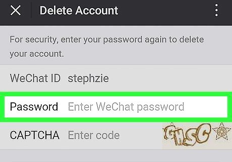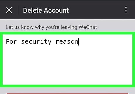 Enter a reason why you're deleting your account. Tap the text field on your screen, and briefly explain why you're permanently deleting your account. WeChat is asking for your reasons only to use it as feedback when developing their products and service. Regardless of the reasons you're providing here, you will still be able to delete your account. You don't have to provide a legitimate reason as to why you're deleting your account. You can just leave it blank if you don't have time.