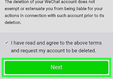 Scroll down and check the confirmation box. It reads "I have read and agree to the above terms and request my account to be deleted." You have to agree to WeChat's deletion terms in order to delete your account. Make sure to read the deletion terms on this page before you check this box. You can't recover your chat history or the contents of your conversations after deleting your account.