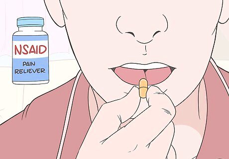 Use NSAID pain relievers to help control pain and inflammation. You can take an over-the-counter pain reliever, such as ibuprofen to help relieve the pain and inflammation in your hip. Follow the manufacturer’s instructions for dosing or ask your doctor for a recommendation. If the pain is severe, your doctor may give you a prescription pain reliever instead, such as a high dose ibuprofen or an opioid pain reliever. Take these exactly as your doctor directs you to.