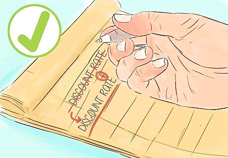 Calculate your discount rate. The discount rate is used to "discount" the future cash flow value back to its present value. The discount rate, sometimes also called the personal rate of return, represents the amount that is "lost" each year due to inflation and missed investment opportunities. You might choose to use the return on a safe investment, plus a risk premium. For example, imagine that instead of investing in the investment providing future cash flows, you could invest your money in treasuries earning a guaranteed return of 2 percent per year. In addition, you expect to be compensated for taking the risk of loss of your money, say a risk premium of 7 percent. Your discount rate would be the sum of these two figures, which is 9 percent. This represents the rate of return you would earn by investing your money elsewhere, such as in the stock market.