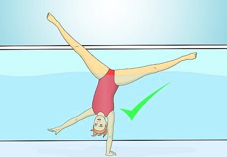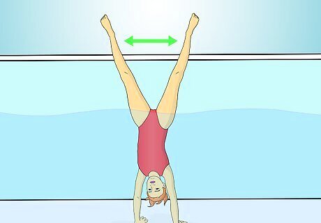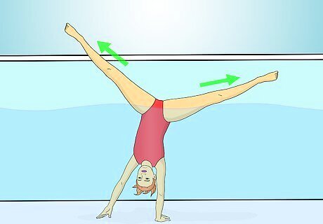 Spread your legs apart. While holding a two-handed handstand, begin to slowly spread your legs apart as far as you can. Remember to keep your back straight and extend your muscles. Don't stretch the legs too far, instead, only spread them to a point that is comfortable. The wider you can stretch your legs, however, the more easier it will be to find your balance due to a lower center of gravity. You may have to move to shallower water if you can spread your legs far enough that your feet begin to dip.