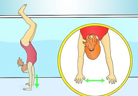 Plant your hands. When you plant your hands, be sure to keep them at least shoulder length apart. The farther apart you can plant your hands, the more stable you will be. Aim to plant your hands where your feet started, this will help get all of your weight directly above you. Try spreading your arms out a bit more if you are having problems performing a handstand. The same with your fingers. The wider your can spread them when you plant your hands, the more stable of a base you will create.