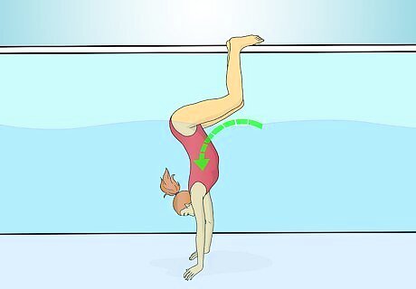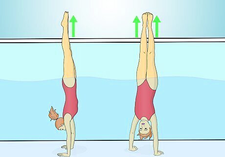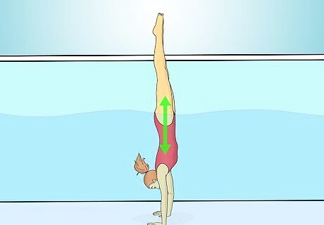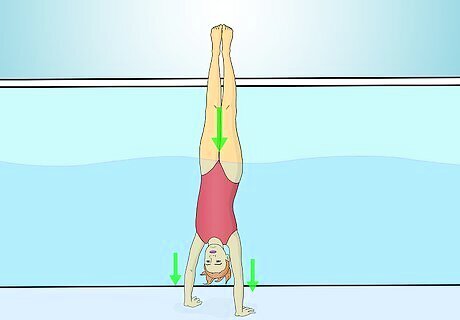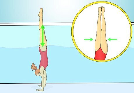 Hold the stand for as long as you can. Remember to keep your legs together and your toes pointed. Once you're upside-down, keep your neck & head straight, looking forward, rather than looking at the bottom of the pool. This will keep your body straighter, and make it easier to maintain your balance. Try to imagine that you are not only standing on your hands, but that you are trying to push yourself upward with every muscle of your body. Extending your muscles will help you gain your balance.