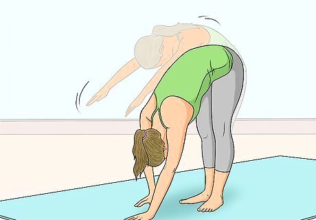 Bending at your waist, roll downwards towards your feet vertebra by vertebra, eventually placing your hands on the mat in front of you. Continue to relax your head and shoulders as you fold forward. If needed, bend your knees slightly to extend further downwards until your hands touch the ground.