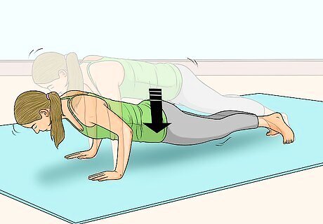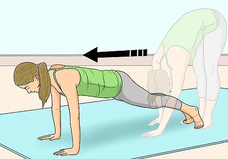 Inhale while bending your elbows downward and backward, bringing your body toward the mat. Make sure the buttocks stay in line with your back.