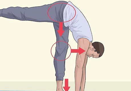 Fold into your standing leg. As your right leg extends upward, draw your body downward by hugging your standing leg. Bring your fingertips back to the sides of your standing leg.