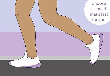 Increase your speed gradually until you reach your desired pace. Bump up your speed 1-2 mph at a time to avoid burning yourself out too fast. The idea is to set a pace that’s challenging, but not so difficult that you can’t keep it up for the full duration of your run. No matter what speed you choose, your primary concerns should be proper form and a steady, moderate heart rate. You might stop at 4-6 mph to stay at a moderate jog. For a more challenging run, continue upping the pace every few minutes until you’re in the 7-7.5 mph range. Building up speed too fast also makes you more likely to get off your rhythm, which could lead to an accident.