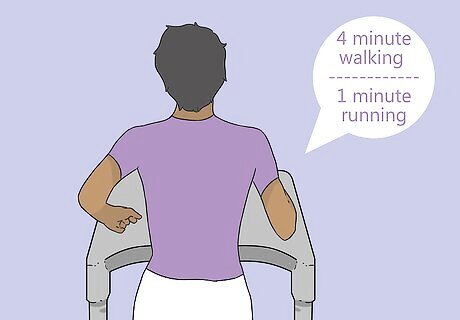 Slow down and walk for 1-2 minutes. Once a minute has passed, decrease your speed to 3-3.5 mph to return to a brisk walk. This will give your heart and lungs a chance to catch up to the increased demands your body has just placed on them. After 1-2 minutes, you’ll have completed your first full interval, and you can prepare to begin running again. During your walking intervals, take deep, controlled breaths to bring your heart rate back down to a normal level. Experienced runners may prefer to push themselves by staying in the jogging range (around 4-6 mph average) rather than slowing to a walk.