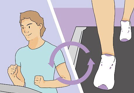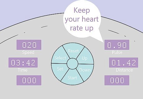 Keep your heart rate up throughout your workout. The key to effective cardio training is keeping your heart rate within a certain targeted range. For most people, this range is about 50-75% of their maximum heart rate. You can calculate your ideal range by subtracting your age from 220 to find your maximum heart rate, then aiming for a heart rate that’s 50-75% of that number. If you’re 32 years old, for example, your maximum heart rate would be 188 beats per minute, which means a heart rate of 94-141 will keep you in the optimal cardio training zone. Exceeding your maximum beats-per-minute could put you in danger of exhaustion. Use the treadmill’s built-in heart rate monitor to check your heart rate periodically by gripping the metal handles just under the display screen.