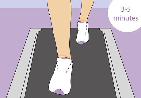 Walk for 3-5 minutes at an easy pace to warm up. Hop on the treadmill and get moving, but don’t go all out just yet. Instead, stick to a slow speed around 2.5-3.5 mph and give yourself time to loosen up. A few minutes of light walking will limber up your muscles, get your blood pumping, and prepare you to turn up the intensity later in your workout. A proper warmup is a must when it comes to preventing injury and performing at your best.