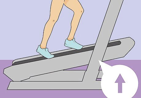 Step up the treadmill’s incline setting. If running on a flat surface isn’t enough of a challenge, increase the angle of the platform to make it feel more like you’re climbing uphill. The incline settings on most treadmills top out at around 7 degrees, but even a slight rise has the potential to make a monotonous workout more challenging. You can change the treadmill’s incline setting to add difficulty to a standard tempo or interval run without being forced to alter your speed or time. For safety’s sake, increase the incline 1 degree at a time, and avoid running at a steep angle (anything higher than about 7 degrees) for more than 5 minutes continuously. Most treadmills have controls that allow users to adjust the incline setting at any point during their workouts. Some even come with pre-programmed modes that mix up the speed and incline automatically to simulate running outdoors.