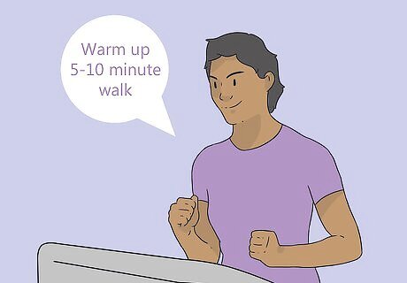 Warm up with an easy 5-10 minute walk. You’ll be running at close to top speed, so it’s important to make sure your body is able to handle the exertion. If you want, you can jog the last few minutes of your warmup to build up to your first running interval. Add 1-2 extra minutes to your warmup if necessary to ensure that you’re ready to go. A warmup that’s too long is better than one that’s too short.