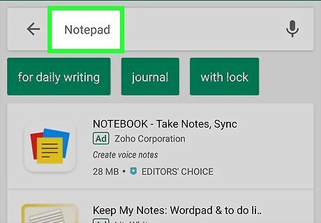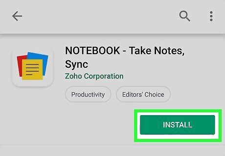 Search for Notepad. The search bar is located at the top of your screen. Since Android and iCloud aren’t compatible, you’ll need to download a third-party app to sync your notes. Make sure you're downloading the Notebook app by "Zoho Corporation".