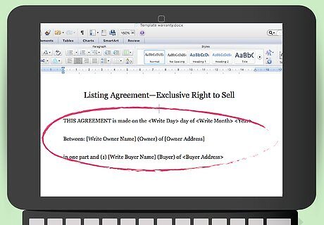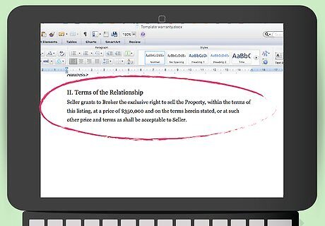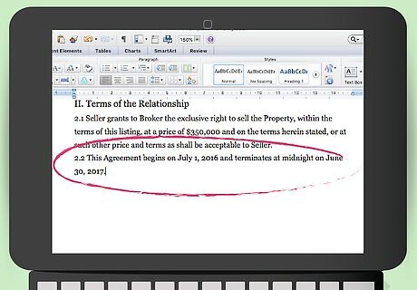 State the listing price. You should state what price the client wants to list the property for. You can also state that you might sell the house at a price acceptable to the seller. For example, you could write: “Seller grants to Broker the exclusive right to sell the Property, within the terms of this listing, at a price of $350,000 and on the terms herein stated, or at such other price and terms as shall be acceptable to Seller.”