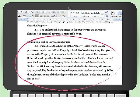 Authorize the use of a lockbox. If the broker lists the property with an MLS, then the broker might want to place a “Lock Box” with a key on the property so that other brokers can access the property. If the broker wants to use a lock box, then you should include a provision in which the seller authorizes the broker to install it. A sample provision could read: “To facilitate the showing of the Property, Seller grants Broker permission to place on Seller’s Property a ‘Lock Box’ containing a key that gives access to the Property at times when the Broker is not present. Furthermore, Seller acknowledges that Broker has recommended that all valuables be removed from the Property for safekeeping. Seller has been advised that neither the Broker, the MLS, nor any Association to which the Broker belongs, will assume any responsibility for the acts of any other person for any loss sustained by Seller through entry or use of the key deposited in the ‘Lock Box.’ Seller assumes the risk of loss.”