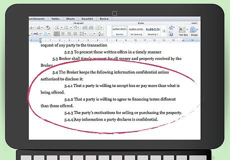 Identify confidential information. The purchase and sale of a house requires negotiation, and successful negotiation often requires that people mask their true motivations. However, they may need to disclose those motivations to a broker. Accordingly, a broker listing agreement might require that the broker keep certain information confidential unless authorized to disclose it. The confidential information could include: That a party is willing to accept less or pay more than what is being offered. That a party is willing to agree to financing terms different than those offered. The party’s motivations for selling or purchasing the property. Any information a party declares is confidential.