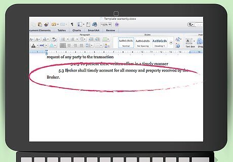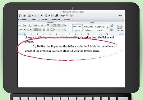 Limit the seller’s liability. You might want to include a provision stating that neither the seller nor the buyer will be liable for the actions or words of the broker. For example, you could write: “Neither the Buyer nor the Seller may be held liable for the actions or words of the Broker or licensees affiliated with the Broker’s firm.”