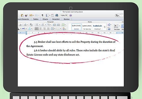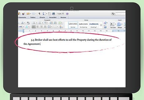 State that the broker will use best efforts. This clause helps put the client at ease that the broker will use his or her best efforts to sell the property. For example, you could write: “Broker shall use best efforts to sell the Property during the duration of the Agreement.”