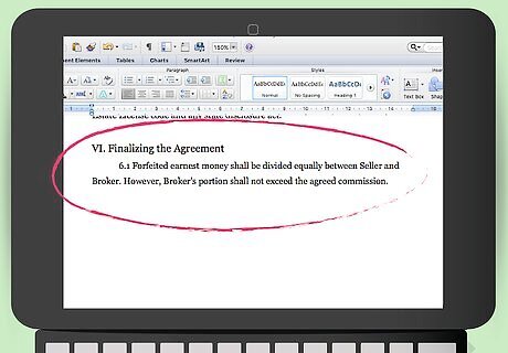 Explain how forfeited earnest money will be divided. The buyer might back out of the sale after signing a purchase and sale agreement. In that situation, the buyer is usually not entitled to having their earnest money refunded. Your broker listing agreement should explain how the seller and broker will divide the earnest money. For example, you could write: “Forfeited earnest money shall be divided equally between Seller and Broker. However, Broker’s portion shall not exceed the agreed commission.”