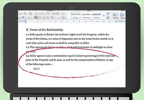 Explain how the broker’s fee is calculated. You can calculate the fee as a percentage of the sale price or as a fixed sum. The seller may also choose to pay both: a fixed fee and a percentage of the sale. Sample language could read: “Seller agrees to pay a commission equal to [insert percentage] of the total sale price of the Property and $1,000, as and for the compensation of Broker, in any of the following events….”